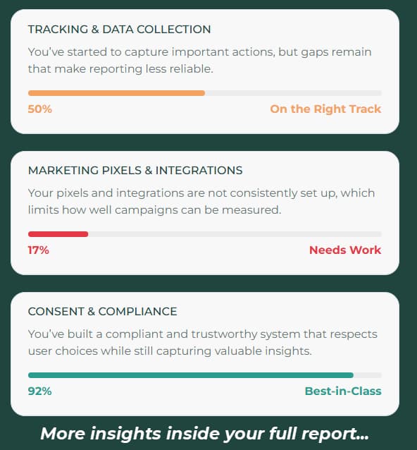 In just a few minutes, you’ll uncover how well your business is tracking data across GA4, GTM, pixels, dashboards, and compliance. See where you’re strong, where gaps are costing you clarity, and what steps you can take to improve.